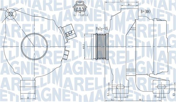 Tensión [V]: 14 Corriente de carga alternador [A]: 150 Poleas: con polea poleas - Ø [mm]: 55